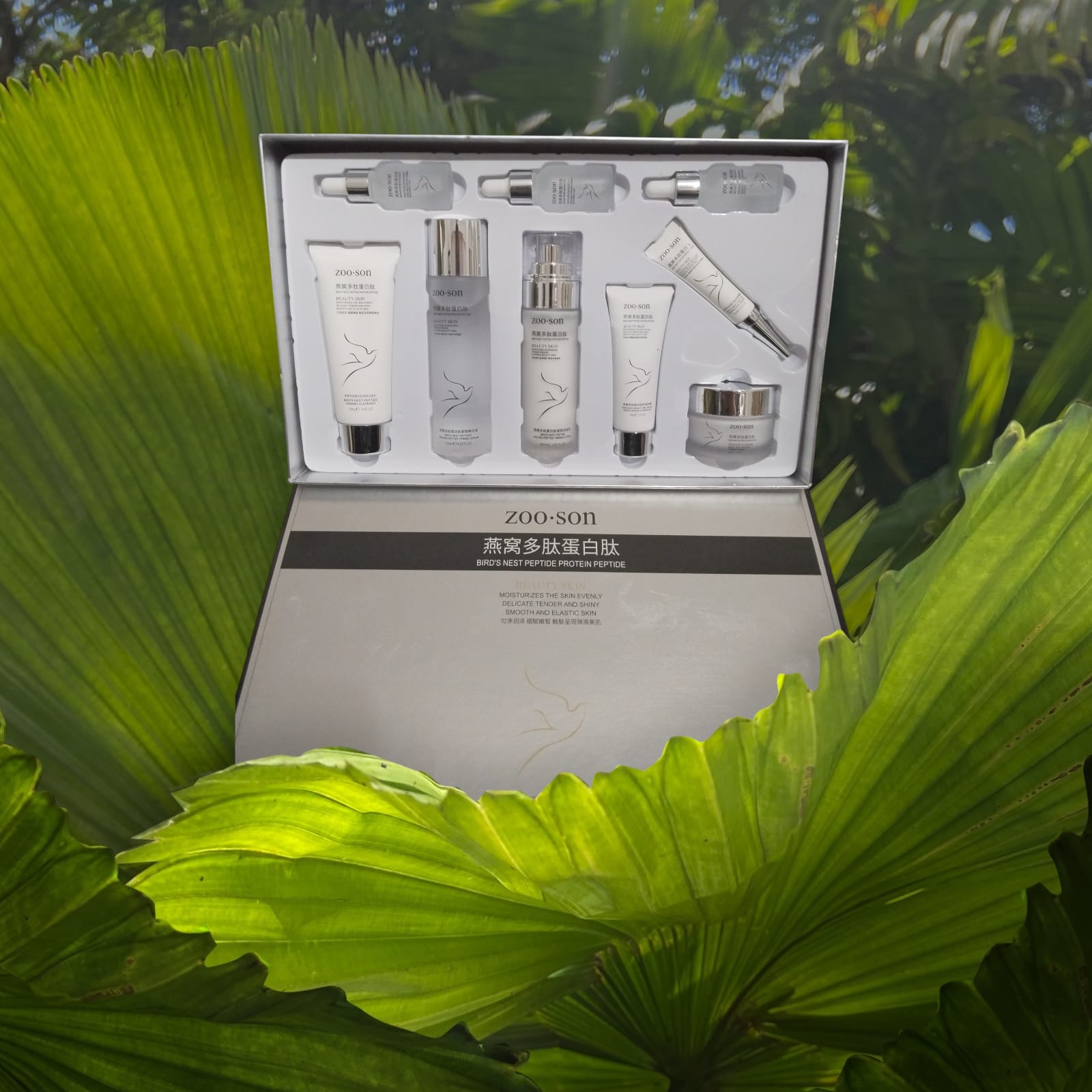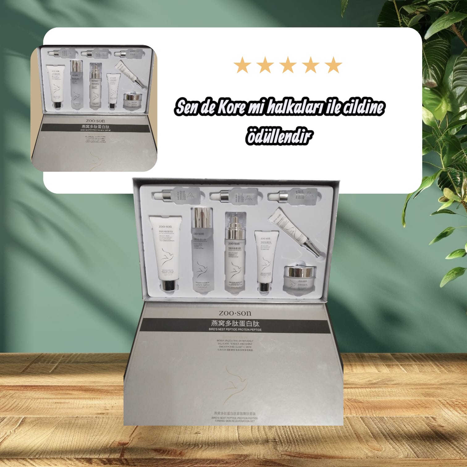ZOO-SON seti, kuş yuvasi özleri ile zenginleştirilmiş polipeptit proteinleri içerir. Bu özel özler, cildin derin katmanlarına nüfuz ederek etkili bir cilt yenileme süreci başlatır. Set, ciltteki ince çizgilerin ve kırışıklıkların görünümünü azaltmaya yardımcı olurken, cildin nem dengesini koruma görevini de üstlenir.