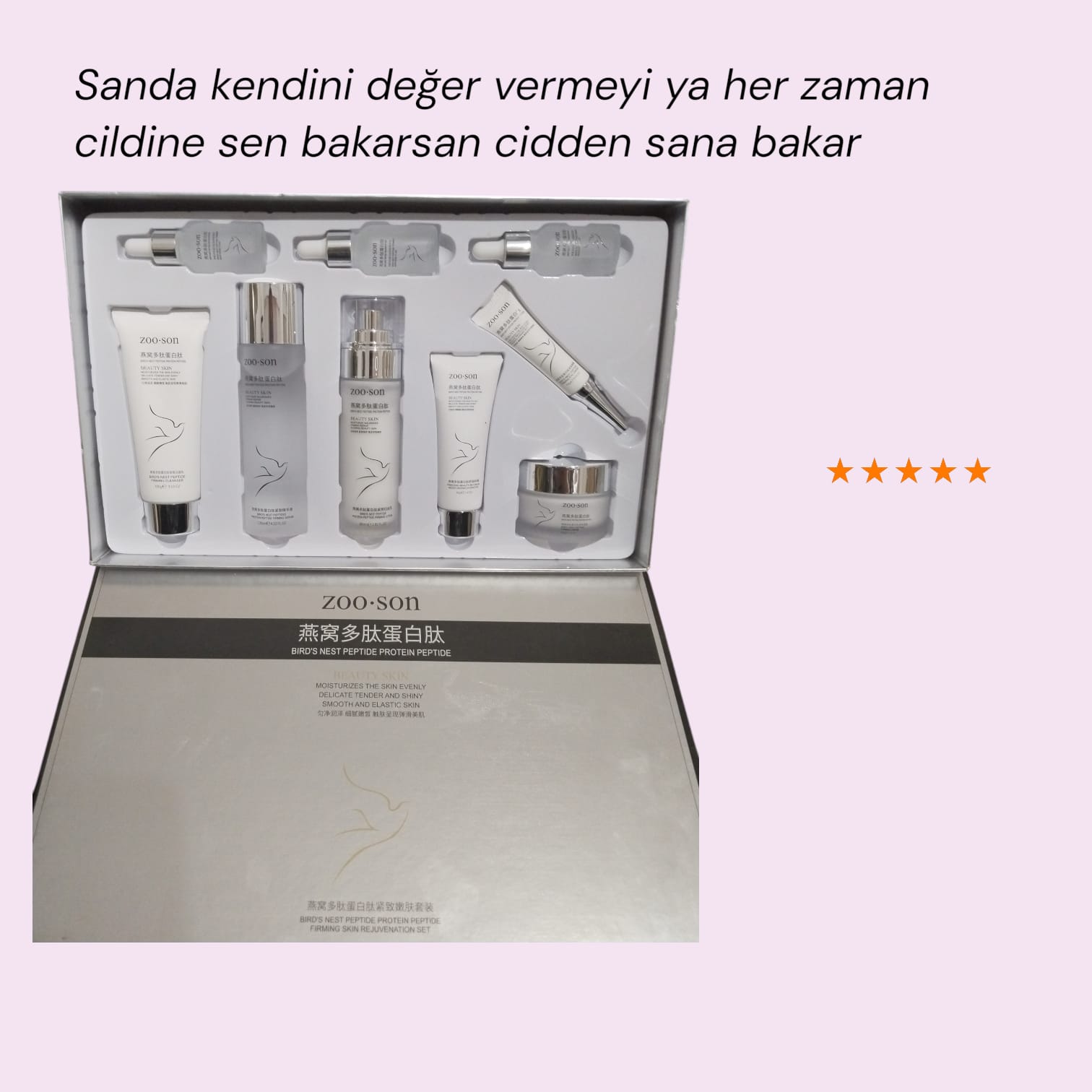 ZOO-SON Kuş Yuvavası Polipeptit Protein Peptidi, cilt bakımında devrim yaratan bir üründür. Doğal içerikleri ve etkili formülasyonu sayesinde, cildinizi sıkılaştırarak gençleştirir. Cildinize ışıltı kazandırır, pürüzsüz bir görünüm sağlar ve elastikiyetini artırır. Bu set, yaşlanma karşıtı özellikleriyle dikkat çekerken, aynı zamanda cilt bakım rutininizin vazgeçilmezi olmaya adaydır.